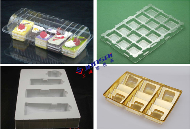 主要適用于PS、HIPS、PVC、PET、PP等塑料片材成型,生產各種盒、碟、托盤、碗、蓋等包裝制品。如:食品盒、蛋糕盒、快餐盒、糕點托盤、超市托盤、醫(yī)藥針劑托盤、口服液托盤.等